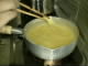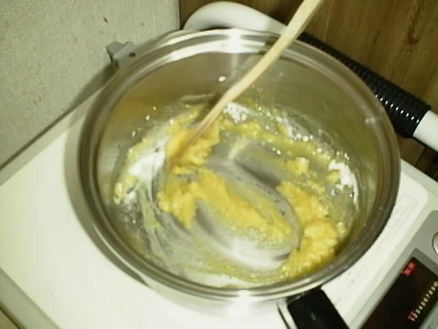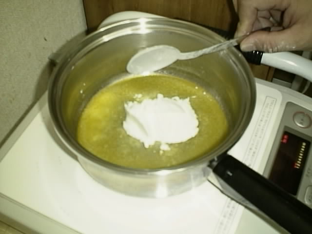 弱火のままで木へらで丹念に混ぜていきます。強火にすると小麦粉とバ ターが焦げ付くので十分注意して下さい。