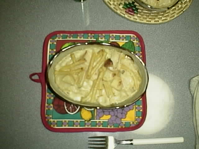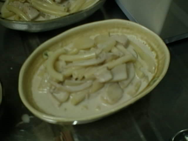 写真では上にホワイトソースがかかっていませんが、炒めた具と混ぜる時に 間違って全てのホワイトソースを入れてしまったのでこのようになってしま いました。