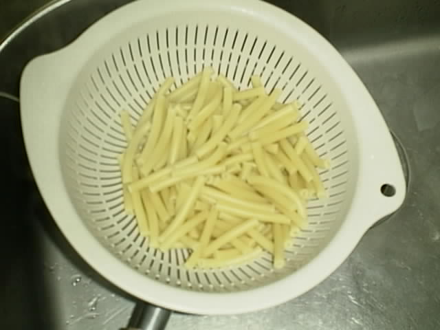 ゆで上がったマカロニはザルにあけてよく水きりをしておきましょう。