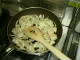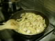たまねぎがキツネ色になったら、しいたけを入れます。しいたけに軽く火を 通したらゆで上げたマカロニを入れます。