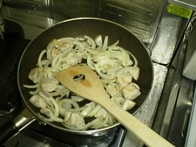 材料が揃ったら、炒めます。まず、フライパン(もしくは 鍋)にバターを入れ火にかけます。バターが溶けたら最初に鶏肉を炒めます。 表面が色付いてきたら、たまねぎとじゃがいもを入れます。