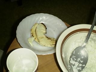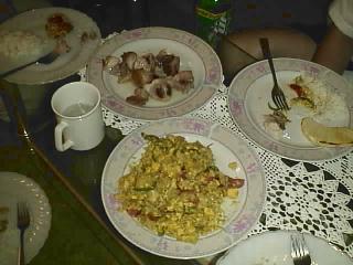 アキーは最初に煮てから野菜や魚と炒めるらしいが、見た目はスクランブ ルエッグのようだった。特に味もない。だが、ソルトフィッシュ(日本で言 うところの、塩鱈である)の塩味が効いているので非常に美味しい。特に、 ご飯の上に載せて一緒に食べると最高である。ブレッドフルーツも一度煮 てから炒めるらしいが、さつまいもみたいで美味しい。スモークチキンも なかなかいける。ジャマイカン・トラディショナル・ディッシュを存分に 堪能することができた。